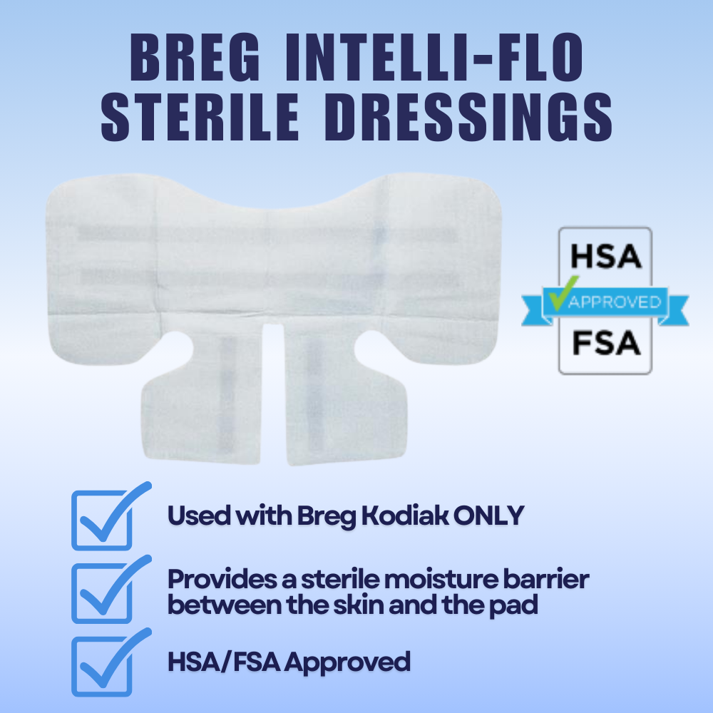 Breg Intelli-Flo Pads Sterile Polar Dressing is water impermeable dressing that provides an appropriate and complete barrier between the pad and the skin of the patient. It is compatible with Breg Intelli-Flo Cold Therapy Pad system. Simply add the sterile dressing to the cold therapy pad and replace the dressing as needed.