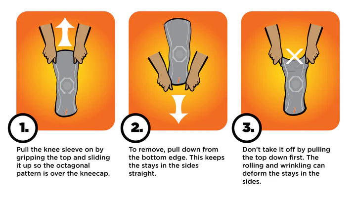 Pull the Knee Sleeve on by gripping the top and sliding it up so the octagonal pattern is over the kneecap. To remove, pull down from the bottom edge to keep the stays straight and avoid rolling or wrinkling that could cause the stays to deform.